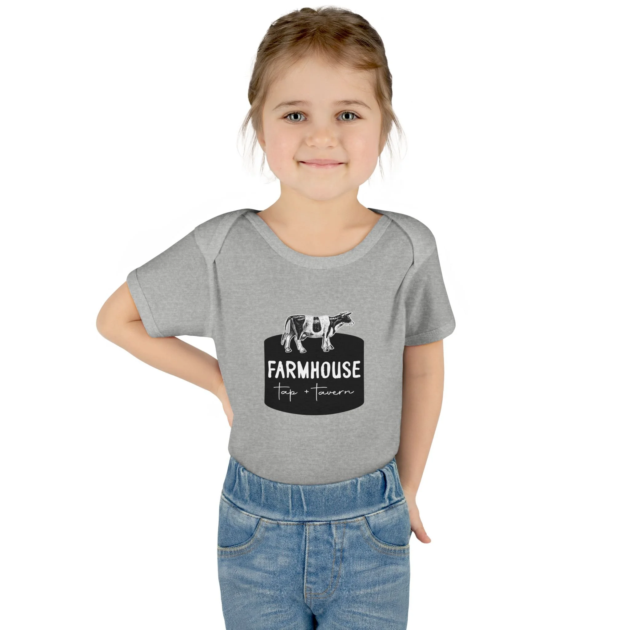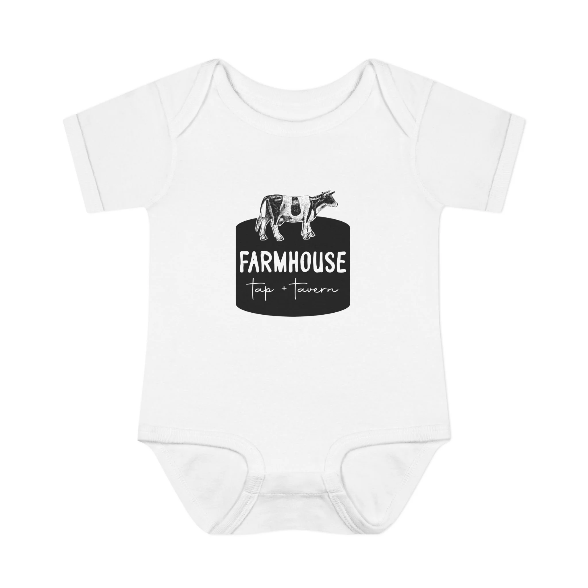 Soft, practical, and quietly charming — this infant rib bodysuit brings farmhouse simplicity to baby’s wardrobe. Lightweight rib knit keeps the shape while the lap shoulder and three-snap closure make mid-day changes quicker and gentler. The black farmhouse graphic and hand-drawn cow silhouette sit low and calm on the chest, so little ones can crawl and nap without distraction. Breathable combed ringspun cotton feels gentle against newborn skin. This piece works like a reliable staple: layer under overalls for a barn-visit, tuck under a cardigan for family photos, or wear alone on warm mornings at home. It’s made to move through the small, messy, beautiful routines of new parenthood with understated country charm.