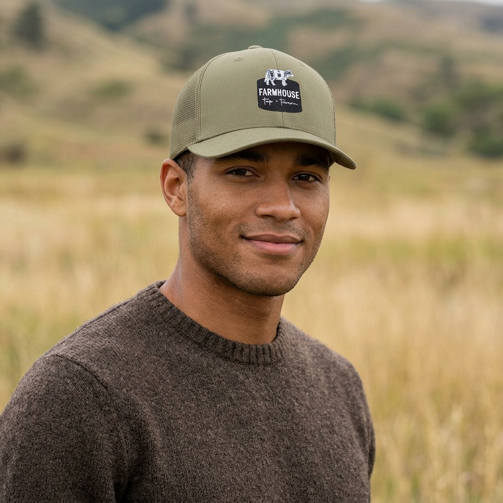This mid-profile snapback brings a slice of farm life to your everyday wardrobe. The structured six-panel crown and precurved visor create a classic silhouette, while the mesh back keeps it breathable through warm days. An embroidered farmhouse emblem on the front gives it a rustic character — think weathered barns, morning light, and slow coffee on the porch. Wear it on errands, weekend markets, or while tending a garden. The adjustable snap lets you dial in the fit, and the soft cotton sweatband keeps long days comfortable. It feels lived-in from the first wear, grounded and quietly familiar.